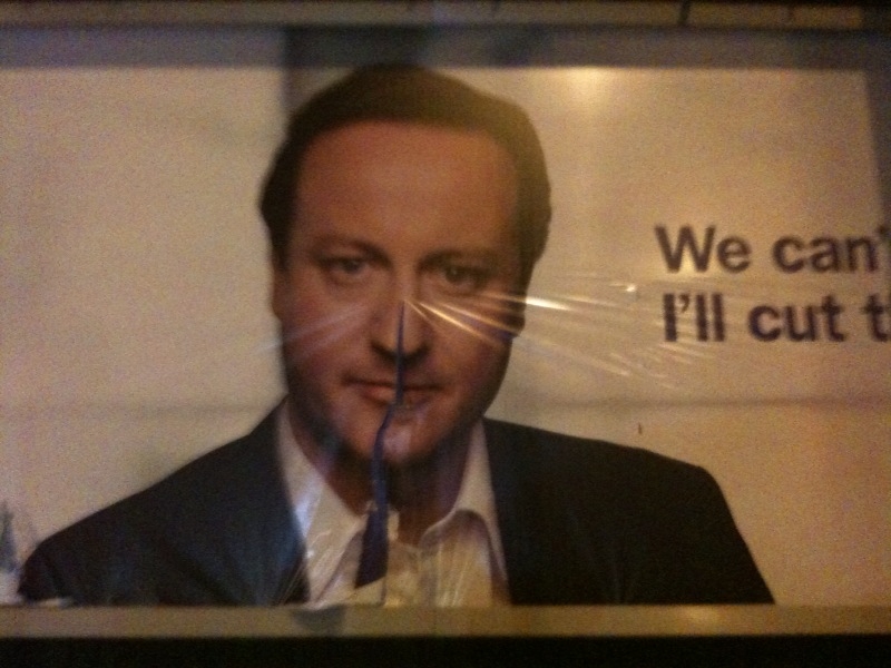 I’ve now been sent 3 photos of the Conservative’s new poster, featuring David Cameron, that have been deliberately disfigured. Given I’m aware of 3, there must be a great number more. This level of vandalism doesn’t really occur on non-political advertising. This could easily be anti-political / anti-establishment sentiment that has always occured at every election that the internet has made easier to document and share. Or is it hostility aimed directly at the Tories and evidence that Dave hasn’t quite managed to shake off the ‘nasty party’ label? It will be interesting to see whether Labour’s posters (if they ever manage to afford to put any up) recieve the same treatment.