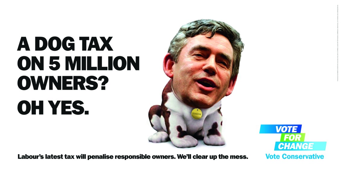 The poster depicts Gordon Brown as the dog from the slightly nauseating Churchill Insurance adverts and carries the canine’s catch phrase in the headline ‘Oh yes’.