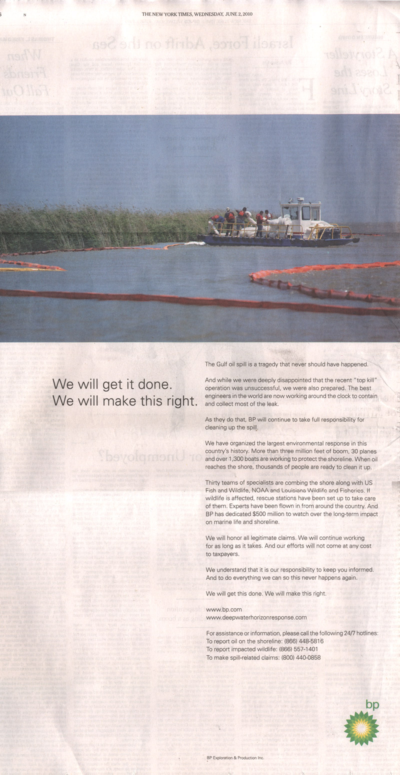 BP have started running print advertising stating that they’re going to “make this right”. This is a tough brief to crack, as you don’t exactly want to show thousands of workers scrubbing clean millions of wild animals or indeed anything too focused on the oil, as that would heap salt in an already gaping corporate wound. But, at the same time, you need to show some sort of clean-up opperation.