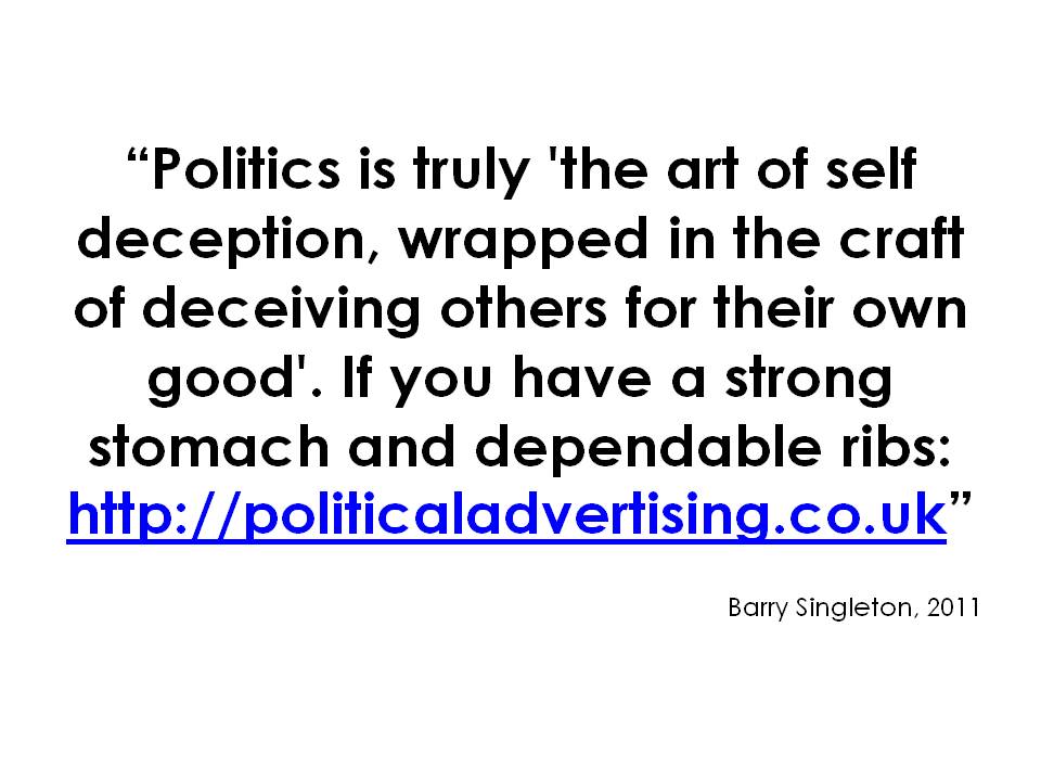 “Politics is truly ‘the art of self deception, wrapped in the craft of deceiving others for their own good’. If you have a strong stomach and dependable ribs: http://politicaladvertising.co.uk”