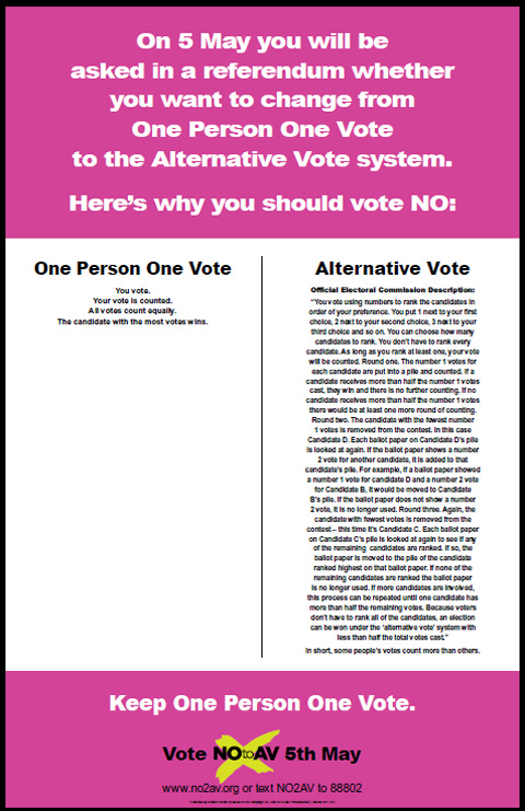 This poster also allows the ‘No’ campaign to claim that it’s educating the electorate about the facts, rather than slinging mud. In fact, the implication that AV would end ‘one person, one vote’ in the broader sense – as opposed to the fact that one will be able to enter votes preferentially – is one of the more misleading claims that has been communicated in the campaign thus far.