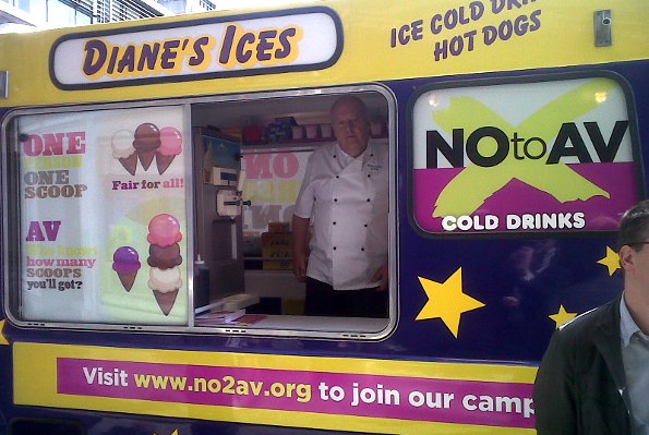 The No to AV campaign have pimped an ice cream with their colours and the slogan ‘one person, one scoop’. I imagine this will have been a relatively costly exercise for what is an incredibly weak analogy.