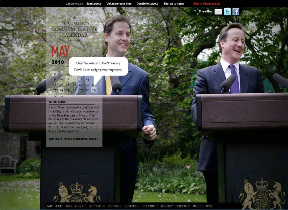 To mark the anniversary of the Conservative and Liberal Democrat coalition, the Labour Party have released an online commemorative calendar which give the electorate a day-by-day account of all the policies that they feel are misjudged and all embarrassing events that have occurred.