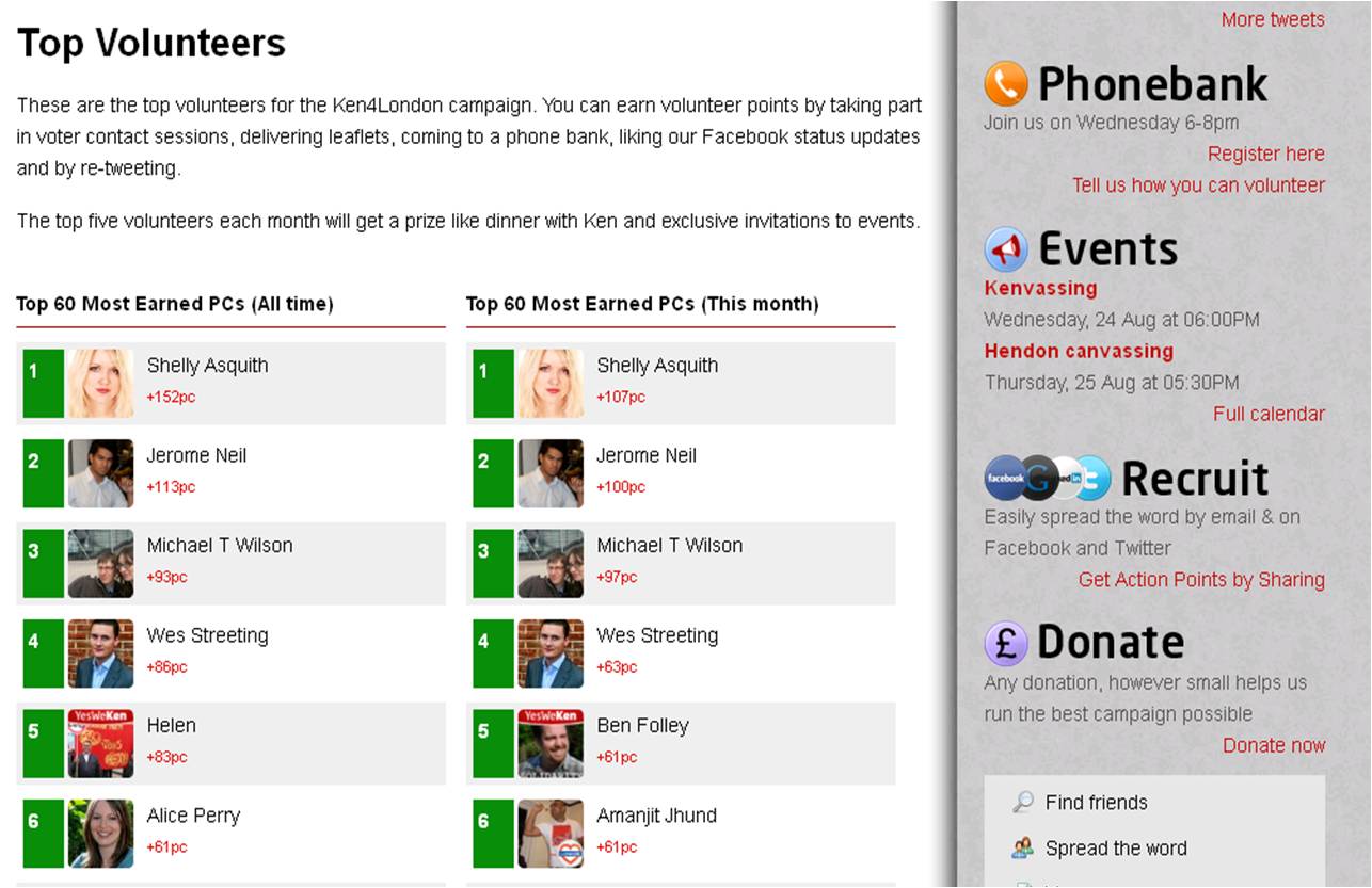 The feature that most impressed me was the activist leaderboard. You can score points by doing both on and offline activities. Presumably turning up to do some canvassing on the doorsteps of Cockfosters will earn you enough points to see you comfortably to the top of the podium.