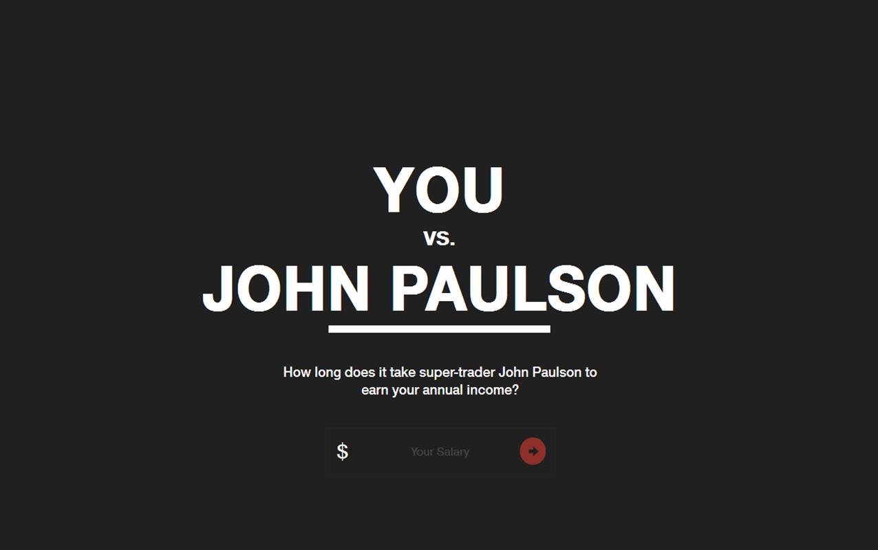 The site asks you to input your wage and then lets you know how depressingly quickly John Paulson, a financial trader who earned a record $4.9 billion in 2010, earns your miserly take-home pay.