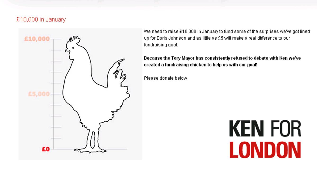 Ken Livingstone’s Team have launched a fundraising campaign mascot – The Chicken. The idea is that supporters donate money to Ken and as the cash flows in the chicken comes to life (to what extent is unclear).