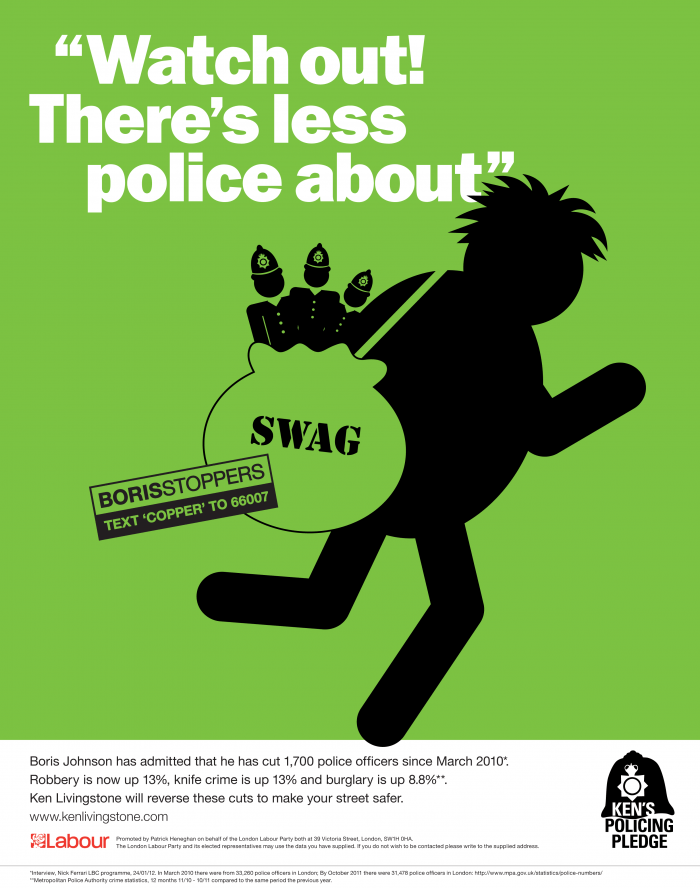 The ad, with the headline ‘Watch Out! There’s Less Police About’, shows Boris Johnson carring a ‘SWAG’ bag filled with London police offices and asks people to help Boris Stoppers by texting ‘Copper’. The advert coincides with the launch of Ken’s ‘Policing Pledge’.