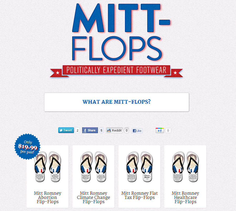 “…open-toe thong sandals designed to make sure you can feel the shifting political winds. Is the climate feeling conservative? Stand on your right foot. Looking liberal out there? Stand on your left foot. With Mitt-Flops, your footwear will be popular in any political climate.”
