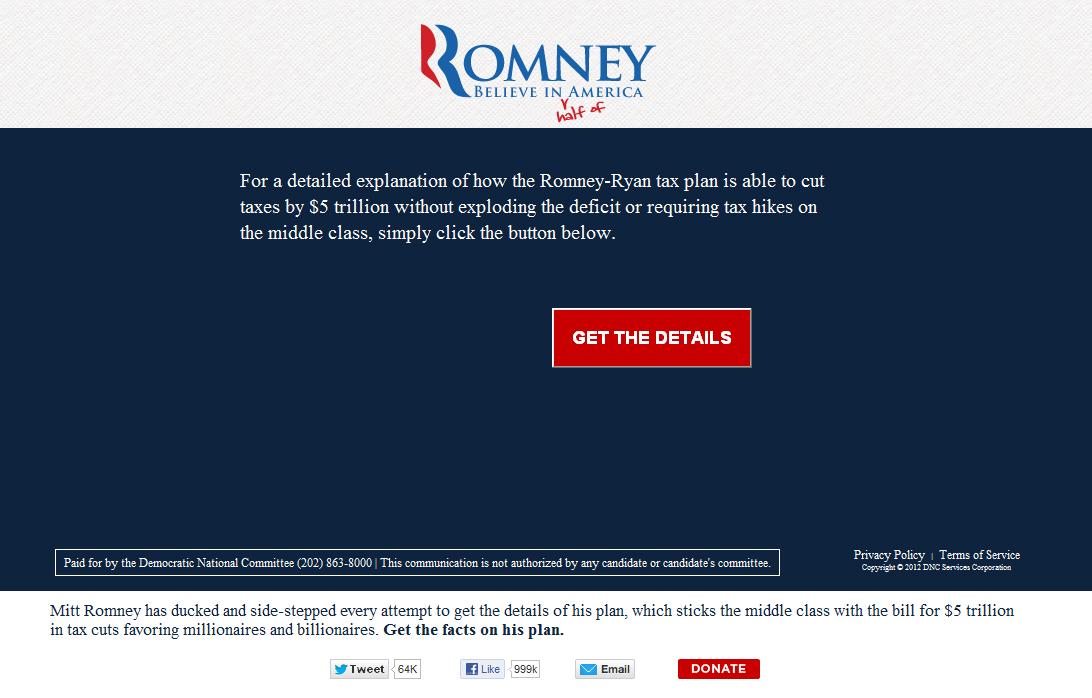 Team Obama have released a website where voters are promised the details on Mitt Romney’s $5 trillion tax plan. However, like a classic schoolboy ruse, when users try and click on the button to ‘get the details’ it dodges your cursor and moves away.