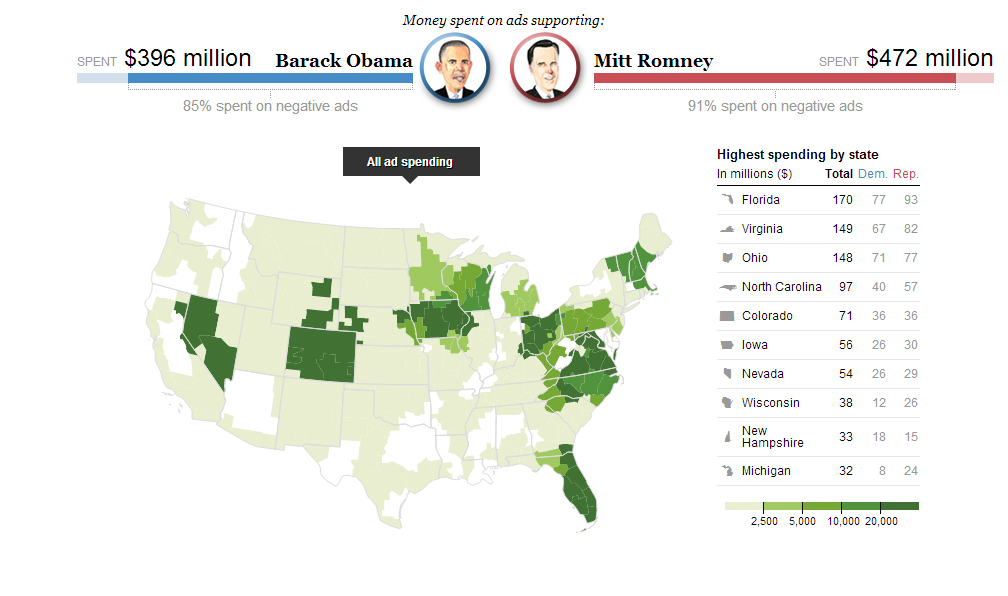 This equates to Romney shelling out $472 million and Obama spending $396 million.