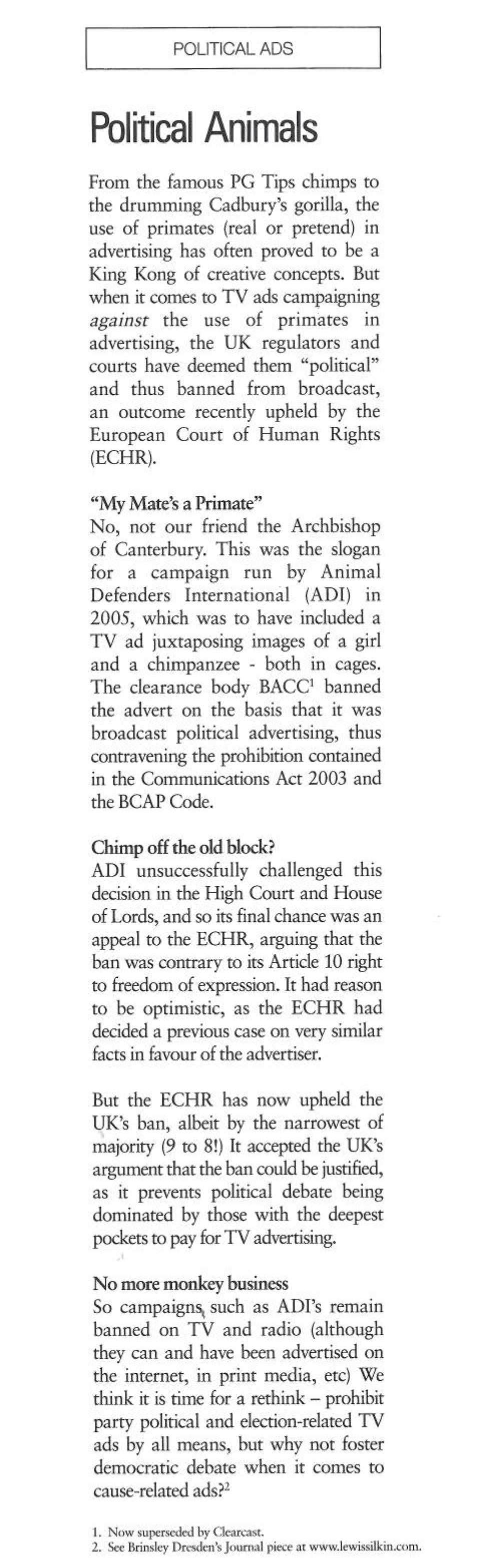 Media law experts Lewis Silkin have written an amusing and informative summary of the European Court of Human Rights’ recent judgement to uphold the UK’s ban on the TV broadcast of political advertising. Animal Defenders International unsuccessfully challenged the Communications Act 2003, arguing that it contravened Article 10 (free speech) of the Human Rights Act.