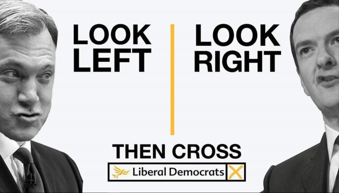 The Lib Dems have run a series of posters using the line: ‘look left, look right, then cross’; the above advert features Ed Balls and George Osborne, two giant and unpopular characters from Labour and the Conservatives respectively.
