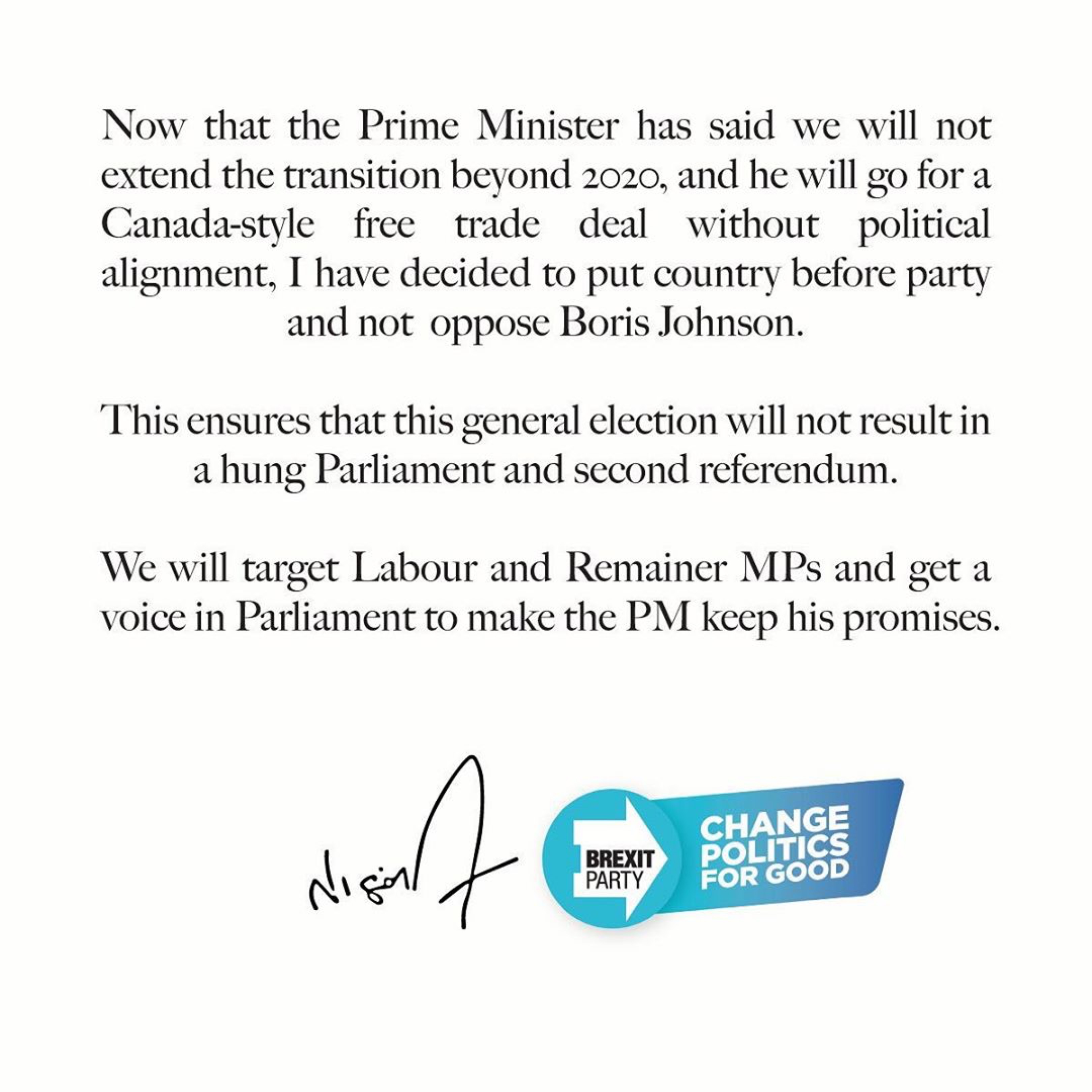 Nigel Farage announced yesterday that the Brexit Party will not stand in the 317 seats won by the Conservatives at the 2017 general election.
