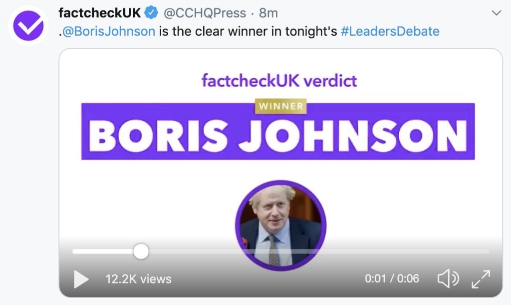 They did so using the programme’s hashtag so those following the debate on twitter would see a seemingly independent body critiquing the Labour leader. CCHQ even posted a video featuring the factchecuk branding announcing Johnson as the winner.