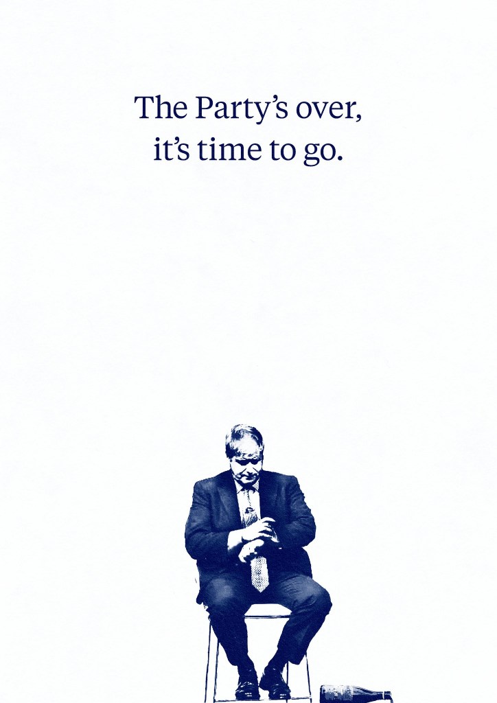 “The party’s over” by @labourdesign is wonderfully bleak. The minimalist style and dark blue tones make the viewer feel a sense of resignation about the situation and encourages the feeling that it’s closing time on Boris Johnson’s premiership.