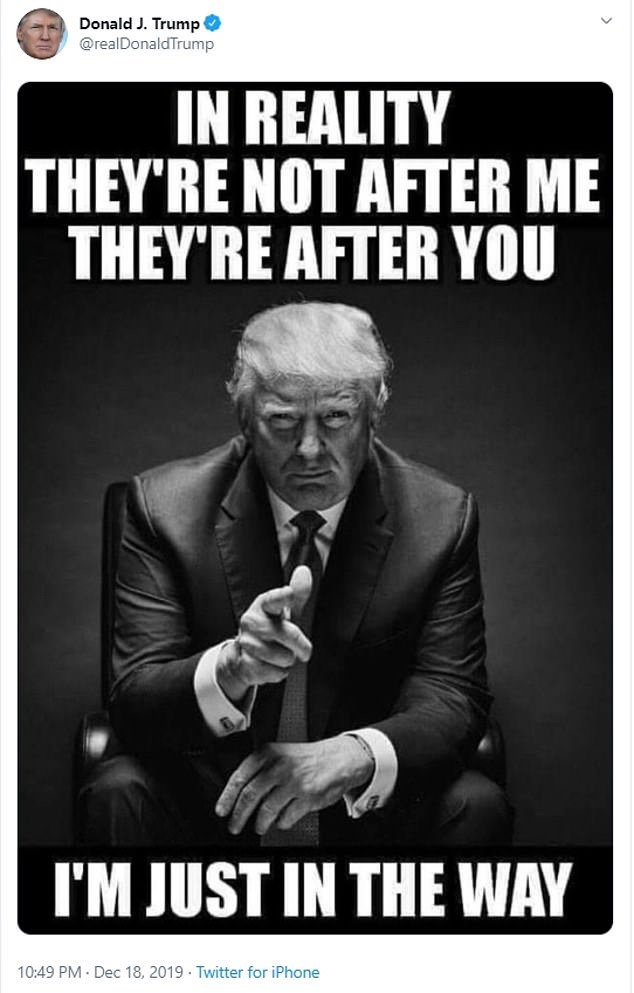 It featured a picture of Trump with a tough guy expression looking straight down the barrel of the camera and carried the headline “in reality they’re not after me they’re after you, I’m just in the way.”