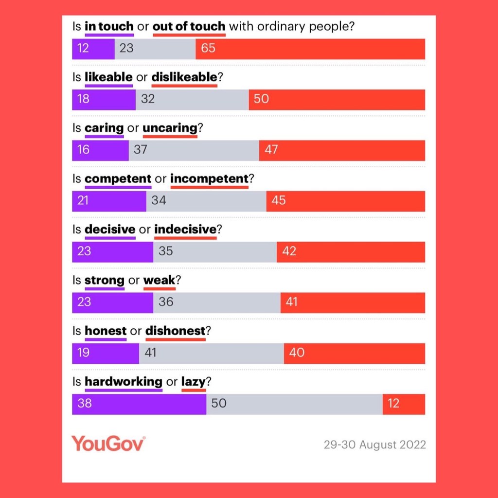 Polling on Truss’s personal attributes shows that a significant majority of the public believe her to be out of touch.