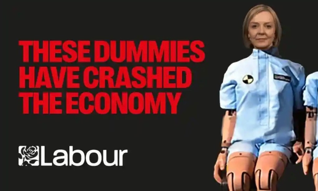 They all feature tight copywriting and nice visual metaphors for either (a) the economic catastrophe that the Tories have unleashed or (b) the government diminishing the country’s reputation on the world stage.