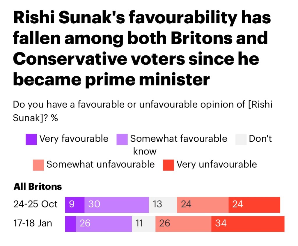 The Conservatives elected a new leader in 1990, John Major, who polled better than the main Tory brand. Rishi Sunak, the Conservatives newly elected leader is, according to recent YouGov, polling 60% of voters view the current Prime Minister unfavourably whereas 67% have an unfavourable view of the Conservatives.