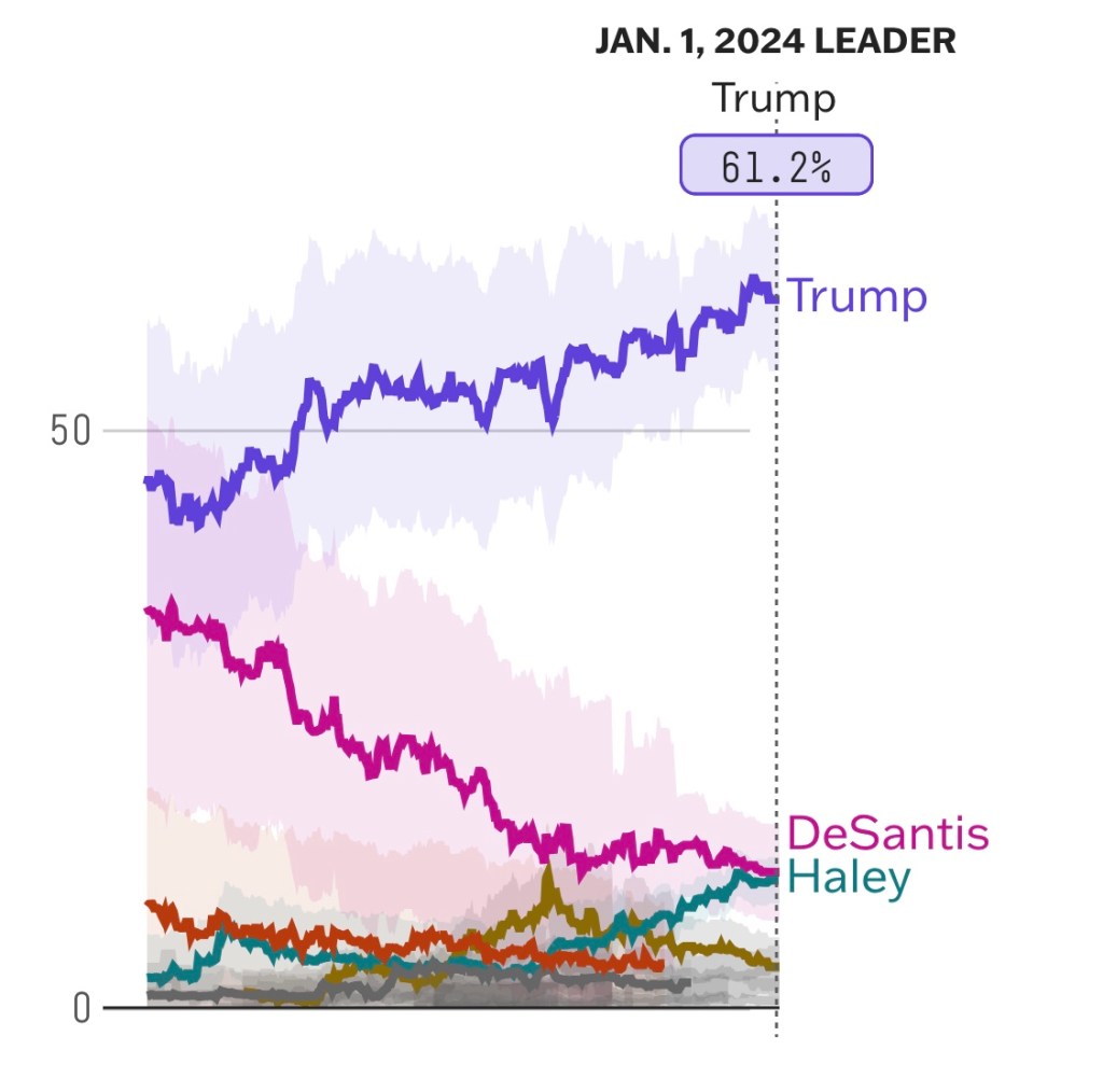 “Haley gained ground in recent months by consolidating support among the minority of the party that opposes Trump. Her gains have not come at the expense of Trump or even DeSantis. Haley has benefited from the exits of Pence and Tim Scott, and Chris Christie’s failure to catch on.”
