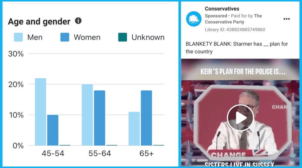 We can see in the Meta audience data when an age cap has been put in place. For example, in an ad which uses the 80s quiz show Blankety Blank as a creative vehicle, there is no reach for anyone under 45. This is because the Tories will have put an age limit on it, probably because anyone under that age won’t have seen the show and so won’t understand the reference.