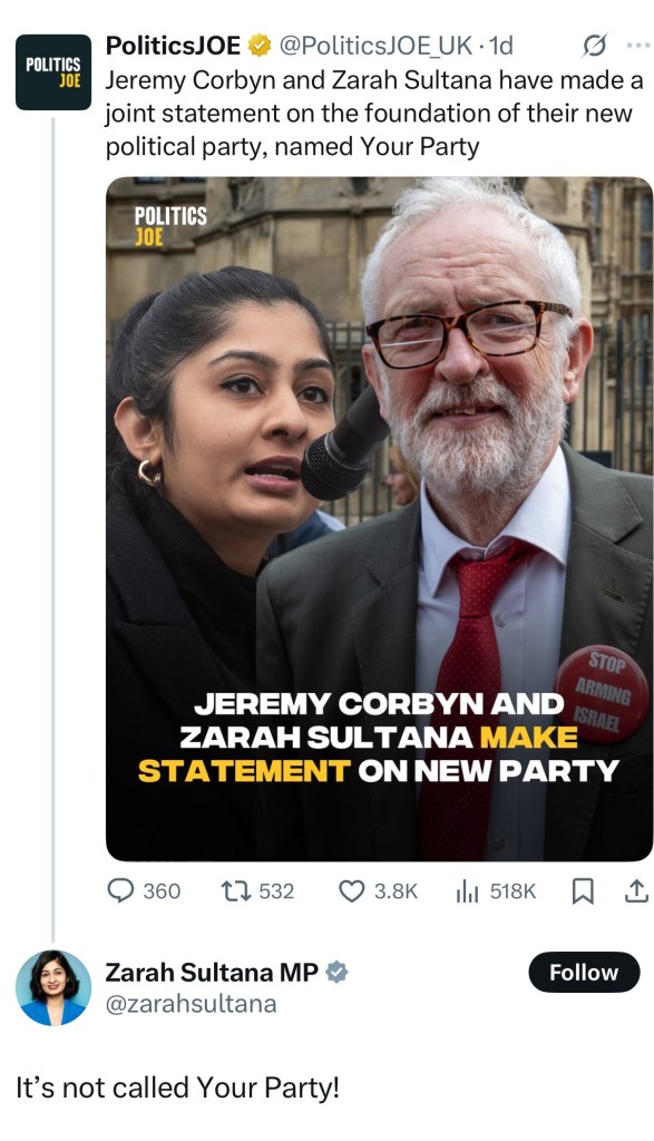 New parties face an uphill battle for credibility. Any operational missteps are magnified by opponents. When Zarah Sultana commented on a Joe.co.uk X post that the name wasn’t definite, it was immediately seized upon by the media as a sign of disorganization. This highlights how intensely new parties are scrutinized. Every other established party has an interest in seeing “Your Party” fail. They will attack from all sides.