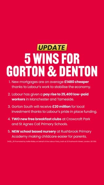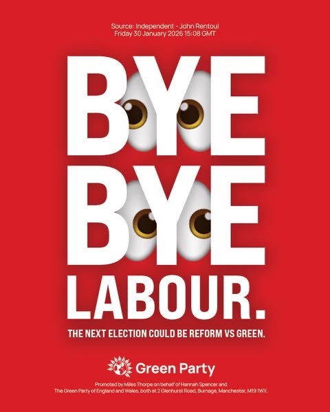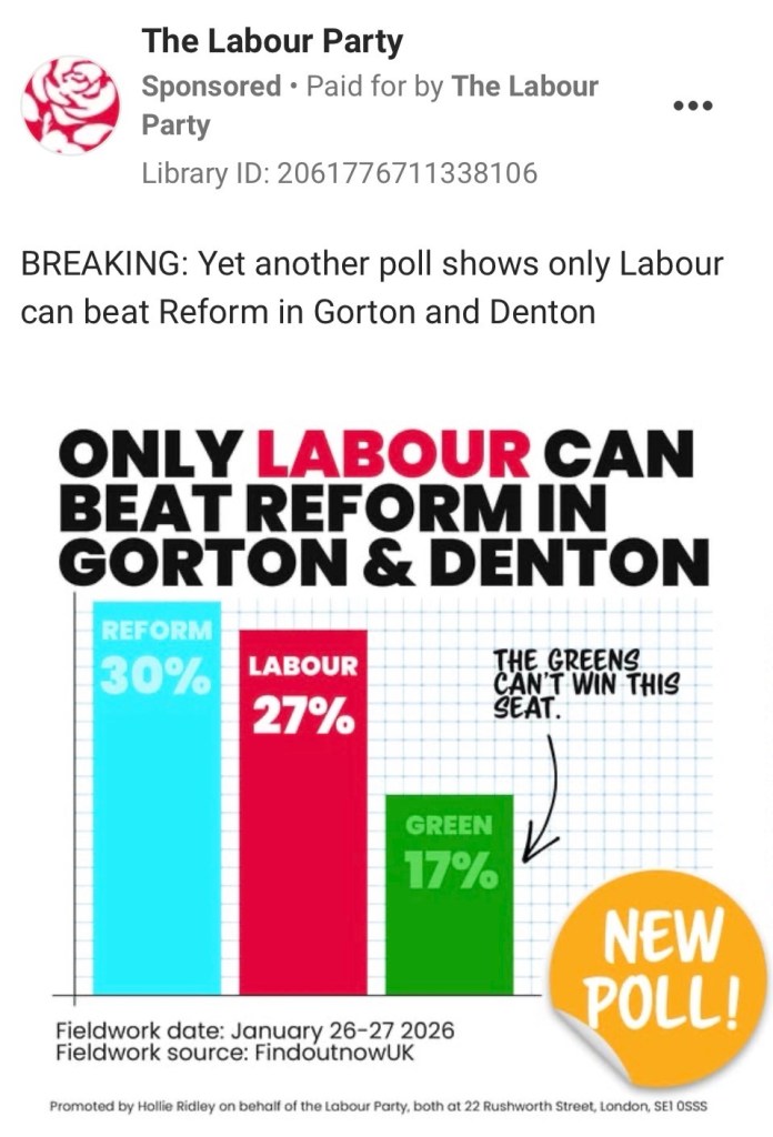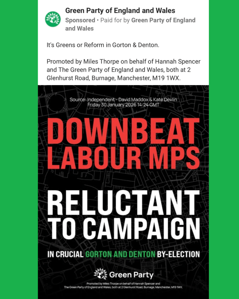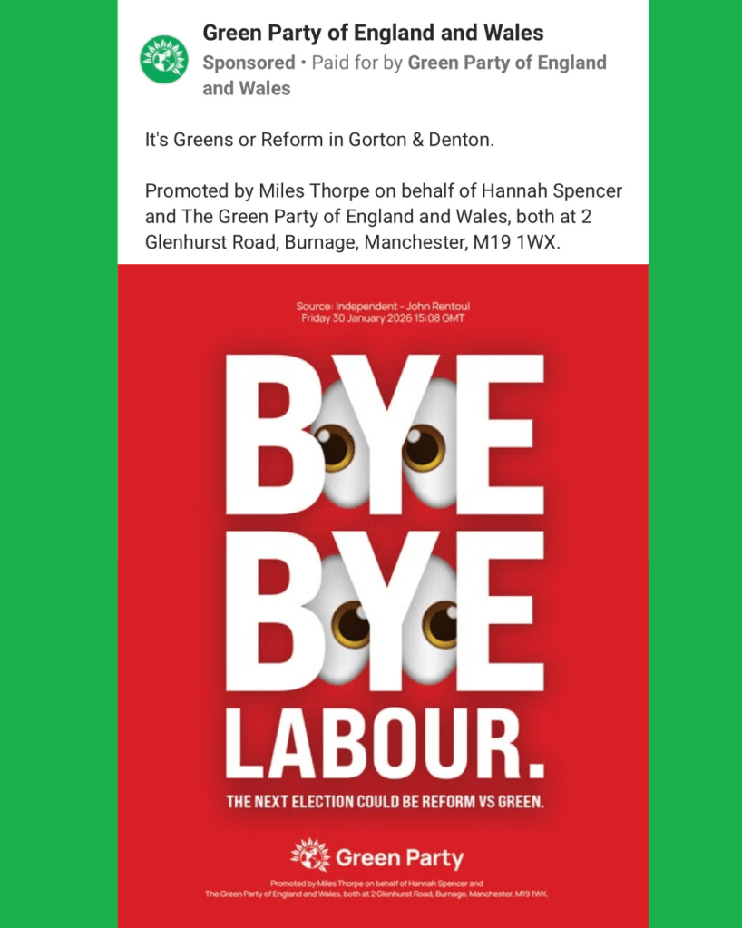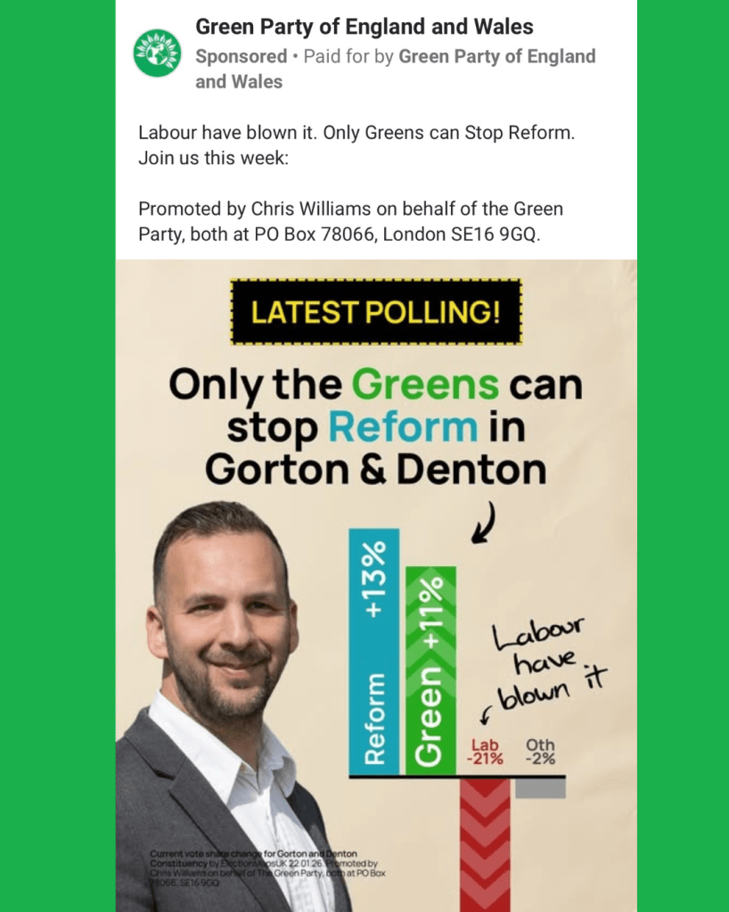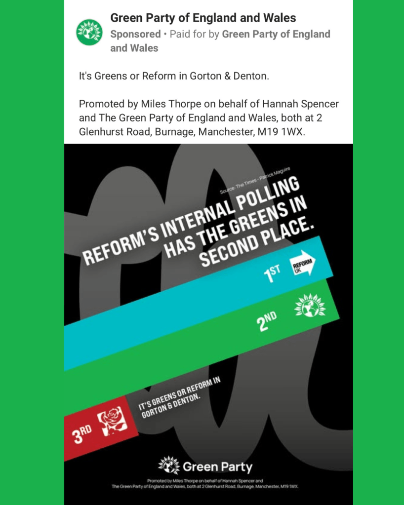Labour is clearly trying to avoid the narrative setting in that they are not the default progressive opponent to Reform UK. Labour is fighting hard in the constituency with Meta ads live which position the Greens as unlikely to win and remind voters of the things Labour have delivered to improve their lives.
