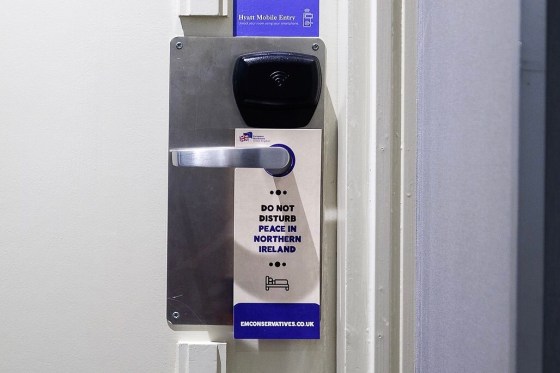 Replica hotel door hangers saying “Do Not Disturb… Peace in Northern Ireland” have been left on the door handles of … More